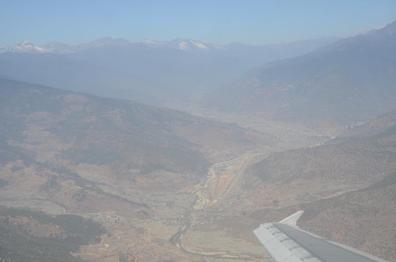 Just off our right wingtip is Paro airport (PBH), the only international airport of Bhutan. It is located in a deep valley at 7,300 feet surrounded by Himalayan mountain peaks of 18,000 feet. Considered one of the world's most challenging airports, there are only a dozen pilots in the world certified to land here! Needless to say, the approach was.... interesting! |