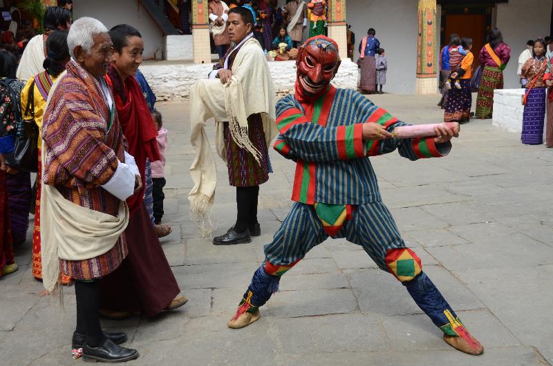 Jesters in cartoonish masks and bright clothing take to the courtyard to lighten the mood and also to assist dancers with any costume problems. They invariably brandish large wooden phalluses for comedic effect.
