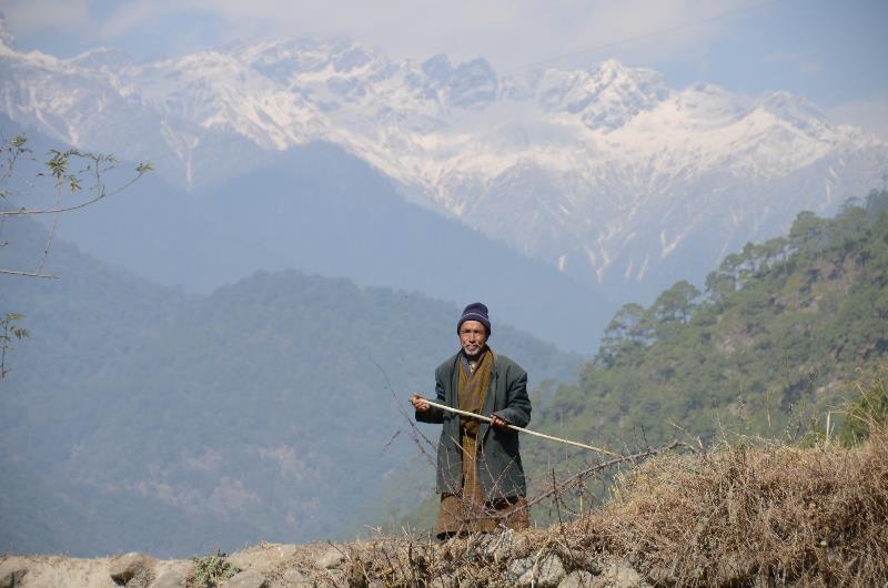 A local herder making his way along the trails in the valley, dwarfed by the Himalayas behind him.