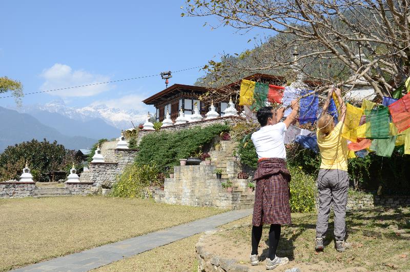 Pam needed a little help from our guide to bring a branch of the tree down low enough for her to hang her prayer flags.