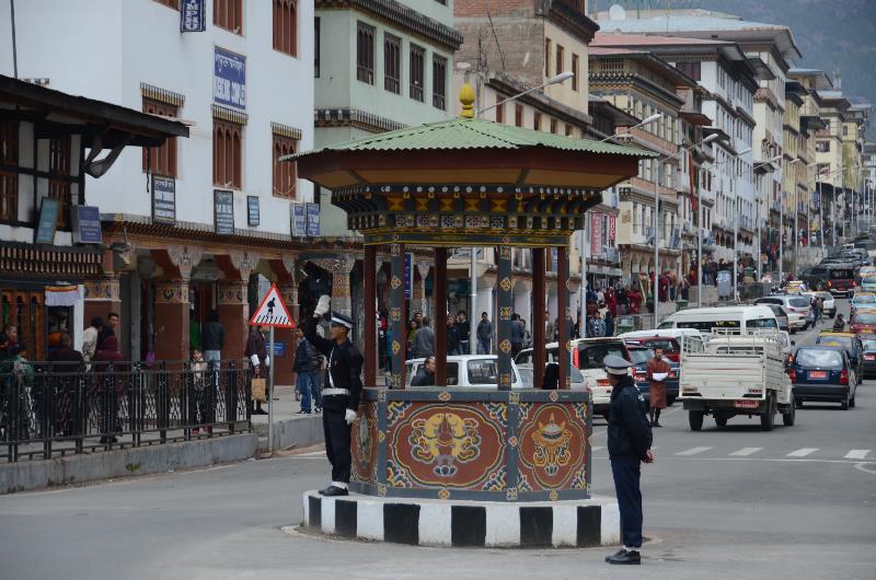 Thimphu is one of just two capital cities in Asia that does not have a single traffic light. (The other is Pyongyang, North Korea.) There was such public outcry when local officials installed a single signal that it was quickly removed, and a traffic officer was re-assigned to this intersection. |