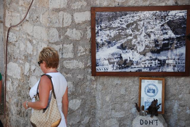 Pam walks along the western edge of the Old Bridge by the large photo of devastated Mostar from 1993. Stari Most was bombed on November 9, 1993. It was rebuilt in the original style and re-opened in 2004.