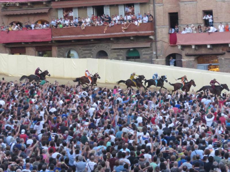 The horses come around on the back stretch toward the finish of this year's Palio, each whipping their horse franatically.
