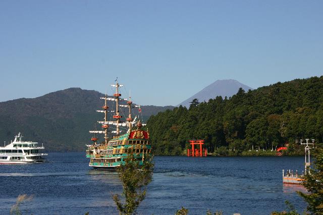 Boats on Lake Ashi pass in front of the Torii Gate marking the entrance to the Hakone Shrine. Mt. Fuji in the background presides over the scene.