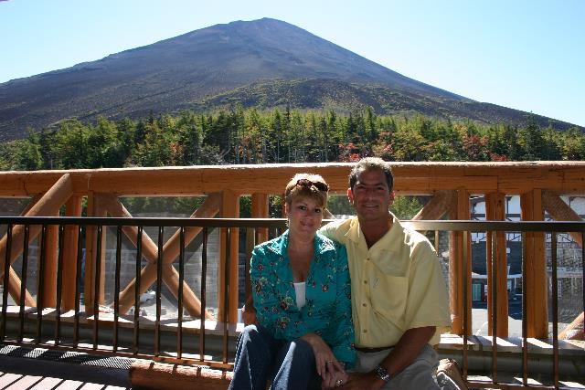 Here we are on the balcony of a restaurant at Fifth Station. The peak of Mt. Fuji seems to loom close by in the background -- but it is still a long way up there. You can see the end of the vegetation just behind us.