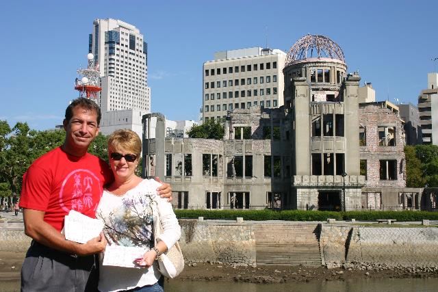 The bombed-out shell of the A-Bomb Dome (formerly Hiroshima Prefectural Products Exhibition Hall) is the only structure from World War II that is left in the city of Hiroshima. It is a powerful reminder of that terrible day, but all around a new, modern city has risen. The beautiful high-rise behind us is our hotel, the Rihga Royal. |