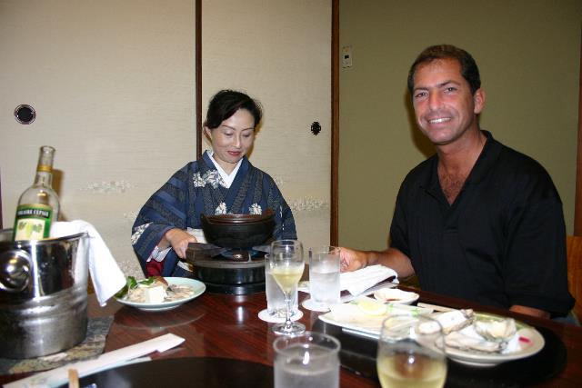 The oyster menu aboard the Kanawa Oyster Boat includes several varieties of oyster prepared in different ways. Here, our personal chef is busy cooking some in a hotpot. You dine in your own private tatami-matted room with the typical sliding Japanese doors. |
