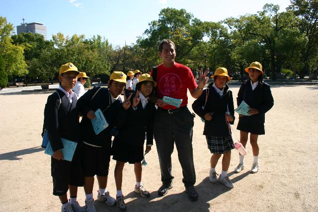 Japanese school children come to Peace Memorial Park in Hiroshima on field trips -- there were hundreds in the park on the beautiful day we visited. Many approached us, asked where we were from and asked for us to sign their books. Then they each gave us a hand-made greeting card with their name, hometown, and their drawing as a peace offering. |