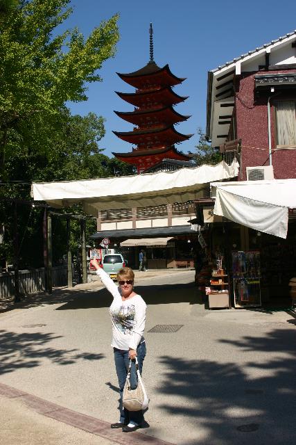 Pam points to the 5-storied pagoda, our next stop on Miyajima.