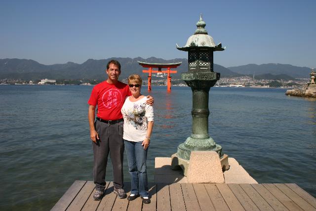 This lantern marks the end of the pier at Itsukushima Jinja shrine. The torii gate stands 500 feet off shore, and the southern edge of Hiroshima is seen on the right side in the distance.
