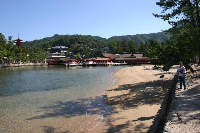 Pam stands along the sandy cove giving an overview of the Itsukushima Jinja shrine on Miyajima. The main portion of the shrine is built on stilts over the water at the end of the cove. You can also see the Gojunoto, a five-storied pagoda on the left. |