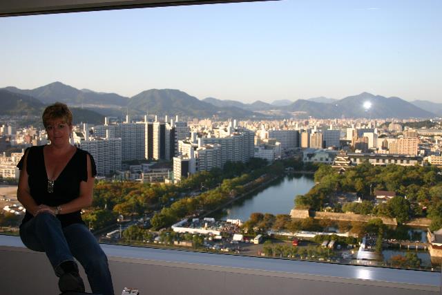 Pam is sitting on the window sill of our hotel room at Hiroshima's Rihga Royal Hotel. The stunning panorama is our view out the window over the city. The green space is actually the grounds and moat of Hiroshima Castle which can be seen emerging from the trees in the right-center. |