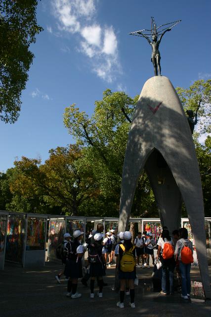 The Children's Peace Monument is probably the most inspiring in Hiroshima's Peace Park. At the top of the 9-meter monument is a bronze statue of Sadako Sasaki who was exposed to radiation from the A-Bomb when she was just 2 years old. Ten years later she developed leukemia, which eventually claimed her life. While she was sick and being treated, she believed that if she could fold 1,000 paper cranes she would recover completely. Despite folding all of those cranes, she lost her battle. Her statue is depicted holding up a giant bronze crane, and in the glass booths around the memorial are thousands of colorful paper cranes folded by the children of Japan in her memory. |