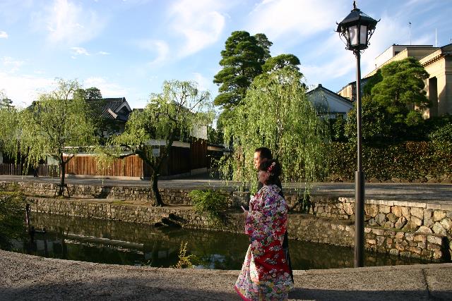 Kurashiki is the quintessential Japanese town, with its canals and weeping trees. You feel like you've stepped in a time machine when a couple like this in traditional Japanese clothing strides by.