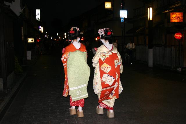 Check out the shoes on these apprentice Geisha as they walk down the street! I wonder how many broken ankles these ladies get? -- I know I wouldn't want to fall from that height. Also, you can see small areas on the backs of the necks which are not painted white with make-up, and the bows of their obis are long -- nearly down to their ankles in the back. |