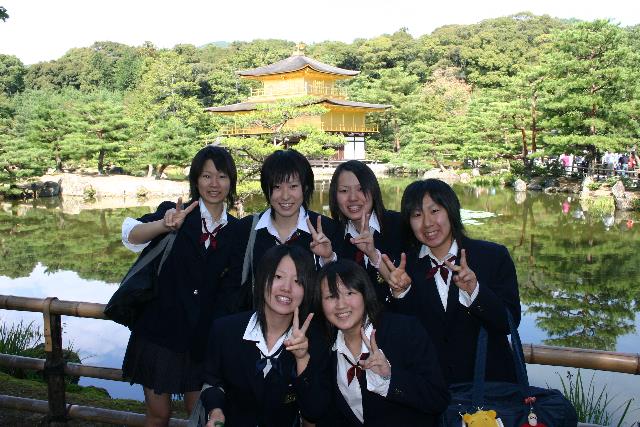 Kinkaju-ji is a popular tourist destination for the Japanese too -- these schoolgirls posed for us in front of the temple.