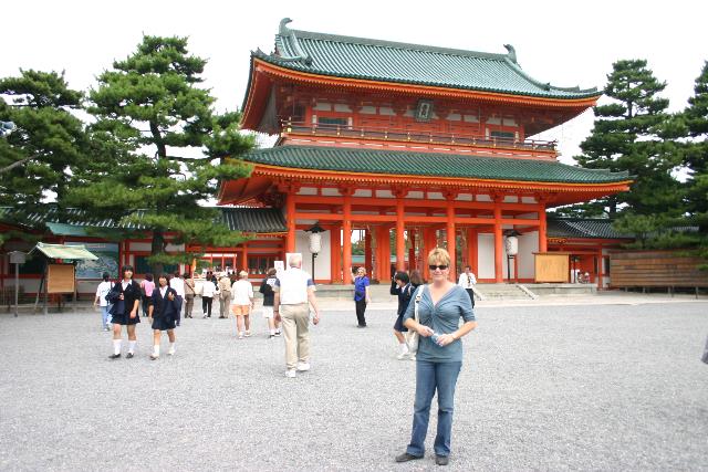Pam at the entrance to the Heian Shrine in Kyoto. The gate is magnificent, painted red with green tiles.