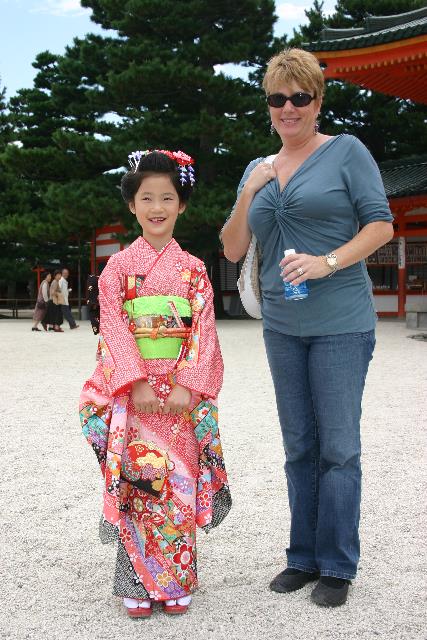 This adorable Japanese girl in full traditional dress was visiting the Heian Shrine while we were there and didn't mind posing for this photo with Pam.