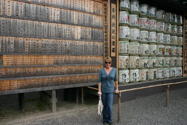 Pam stands in front of a decorative wall just outside the shrine. I don't know what the small wooden plaques on the left say, but those are barrels used for making sake on the right.