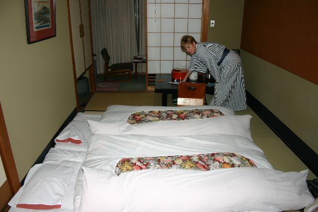 After dinner, the maid pushes the short lacquered table to the side and puts out futons and cotton-filled quilts on the tatami-matted floor. There's your bed for the night; sweet dreams! Pam is pointing to an origami bird with handwritten note wishing us a good night's sleep. |