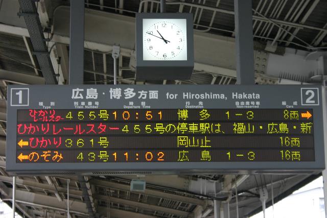 As you can clearly see from this sign, we've got 2 minutes to get on our train number 455 departing for Hiroshima at 10:51. The train goes on to Hakata (also known as Fukuoka) which is on the western island of Kyushu.