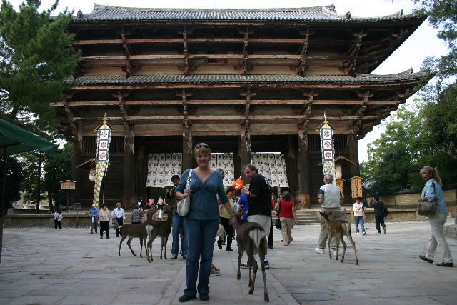 Pam stands in front of the Nandai-mon, an impressive dark wooden gate supported by 18 large pillars and leading to the main temple complex at Todaiji. The deer follow the tourists looking for cookies.