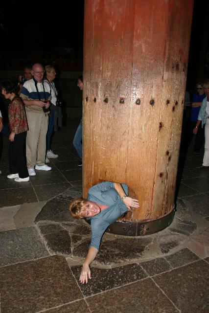 Inside the Hall of the Great Buddha, this support pillar has a small hole cut in its base. It is said that if you can crawl through it, you will have good luck. Pam made it!