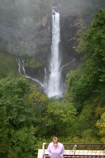 Looking down on Pam who is standing on the observation deck for viewing Kegon Falls.