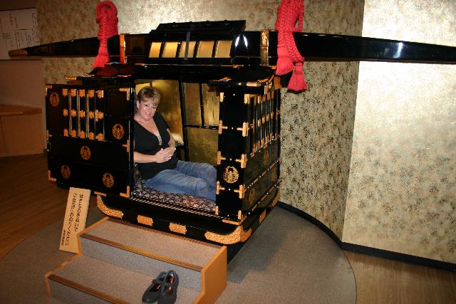 Inside Okayama Castle is a fine collection of samurai arms and armour, plus palanquins (covered sedan chairs) like this one Pam is relaxing in.