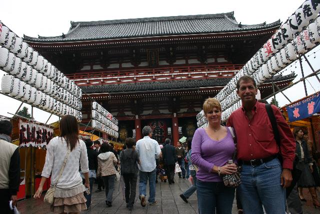 Here we are coming to the Hozo-mon, the gate to the Asakusa Temple courtyard. The approach is lined by scores of lanterns. It is also a repository for sutras (Buddhist texts) and other treasures of Senso-ji.