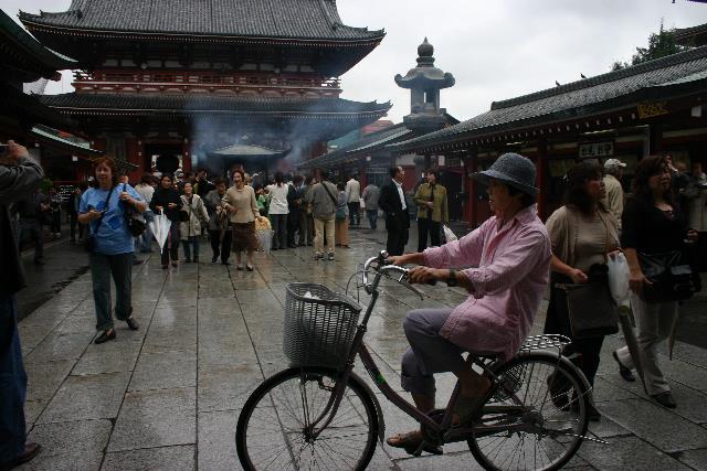 The Senso-ji complex in Asakusa is a very popular place for the Japanese to visit. They arrive by foot, bicycle, and subway in droves and most of them stop at the big incense burner in front of the Main Hall. It is thought that bathing ones hands and faces in the smoke will ward off illnesses. |