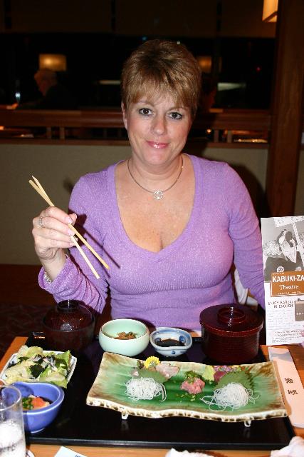 Pam is enjoying fresh sashimi at a restaurant in Tokyo before we attend a Kabuki performance.