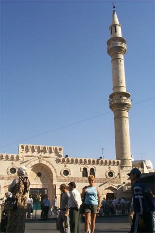 The Hussein Mosque is in the center of Amman, a city of about 1.5 million. Pam stuck out like a sore thumb as the scantily clad American tourist!
