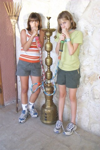 Stacy and Rachel Hochman share a typical Arab pipe. Pipes like this one are smoked after meals or for pleasure. "Don't worry mom, this one's not loaded!"