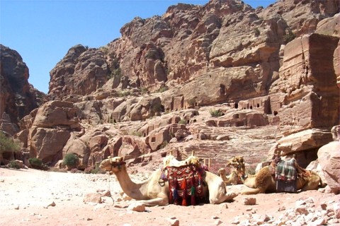 Camels can be hired to walk through the extensive ruins in Petra. On the right above the camels is Petra's 7,000 seat theatre, also carved out of the sandstone.