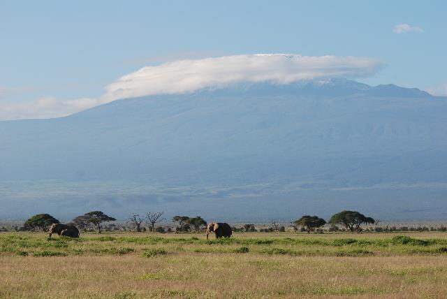 African Elephants look pitifully small when draped against the background of Mt. Kilimanjaro, the highest peak in Africa.