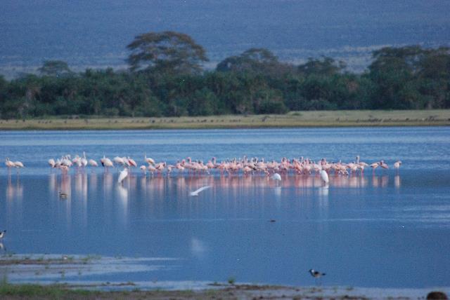 Flamingos seem to always be in the water when we go looking for game in Africa. They get their pink color from carotenoid proteins in their diet of shrimp and plant plankton.