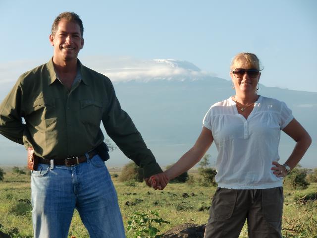 | Yeah, sure. We're all smiles now - we've got a nice view of Mt. Kilimanjaro. But we've got a grand plan which includes climbing that behemoth in the summer of 2011. See that flat part at the top? That's where we want to be standing. If we make it next year, we'll be more than grinning! |