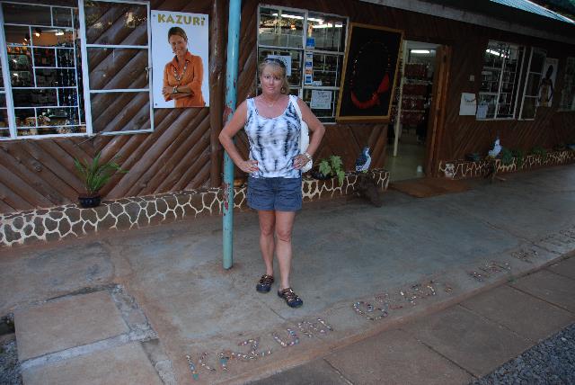 | Pam at the Kazuri Bead outlet not too far away from the Karen Blixen estate. "Kazuri" means "Small and Beautiful" in Swahili. The bead business was started by Lady Susan Wood who also started a coffee plantation on the Karen Blixen estate back in 1947. |