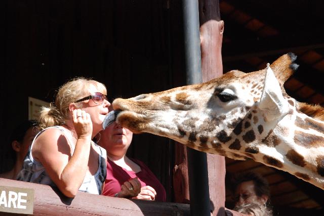 Here's the money shot! A giraffe with its tongue on Pam's mouth! Yuck, right?