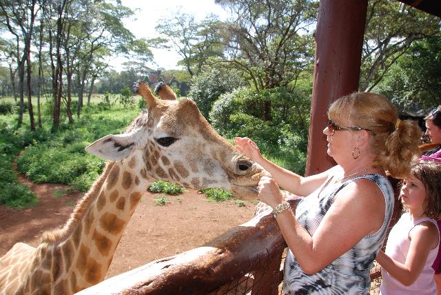 Pam felt like a big kid at the Giraffe Center, offering a food pellet in one hand and petting them with the other.