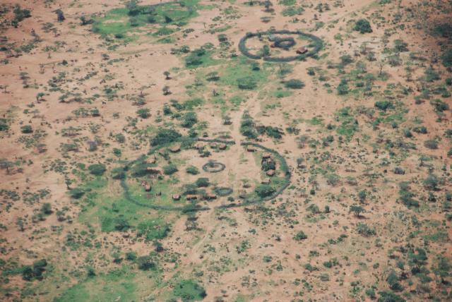 | Taken from the air as we flew into Nairobi, this is what a typical Maasai village looks like. They create a living fence around the grounds, build their huts in a circle and keep the animals in pens in the center. It's incredibly basic living - no power and note that there is no water immediately nearby. |