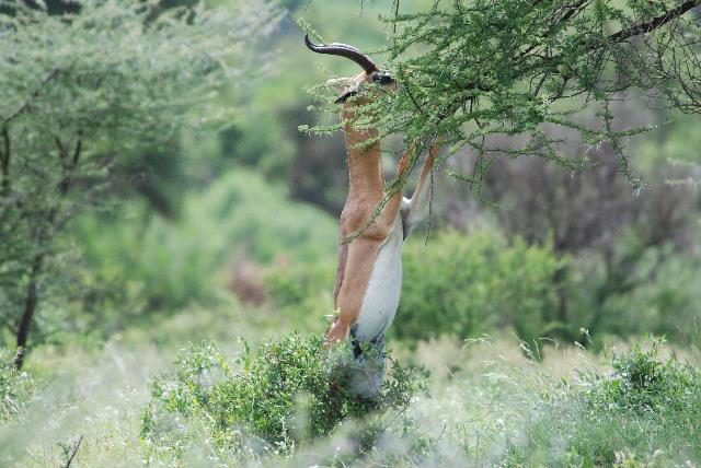 Gerenuks eat food from higher places than most other gazelles and antelopes - they do this by standing up on their hind legs and stretching out their long necks to get food off small trees or tall bushes.