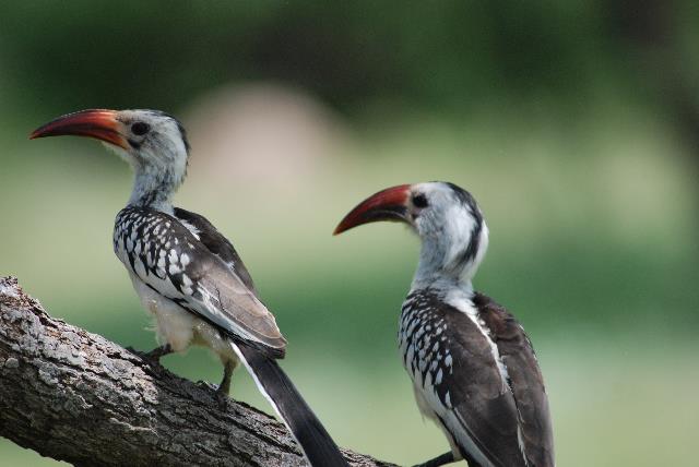 | These are Red-billed Hornbills. They are omnivores, taking insects, fruit and seeds mainly off the ground. They are pretty easy to spot as they announce their presence with a noisy, accelerating tok-tok-tol-toktoktok call. If it looks familiar, it might be that you recognize this bird represented as the character "Zazu" in the animated film "The Lion King". |