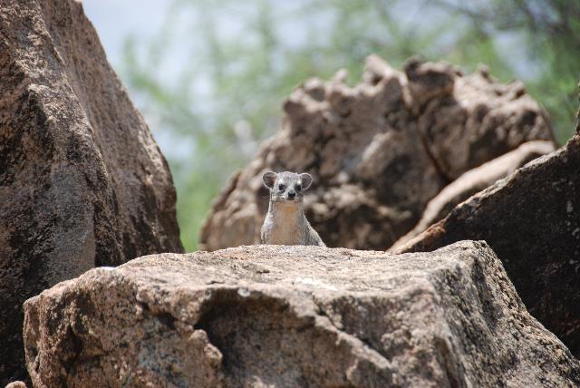 | This cute little critter is a Rock Hyrax. They are well-furred rotund creatures with a short tail and they're fairly shy. They are sometimes described as being the closest living relative to the elephant - but they look like a cross between a rat and a guinea pig to us. |