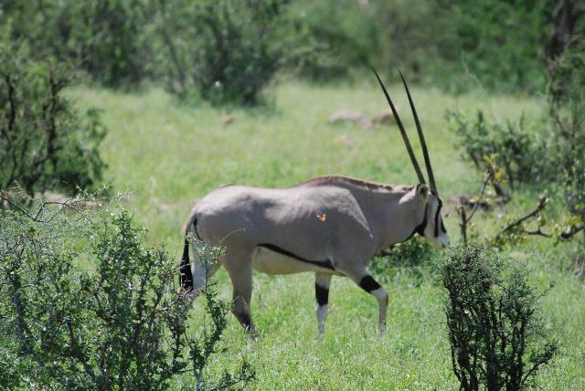 The East African Oryx can eat grass, leaves, fruit and buds. They are easy to pick out with those long pairs of horns.