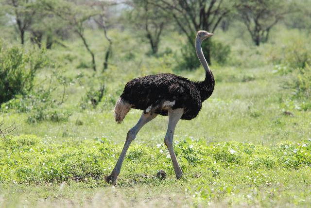 The male Somali Ostrich is more colorful - with black plumage and white tail feathers. You can better see the bluish skin on his neck and thighs - these areas become bright blue during the mating season.