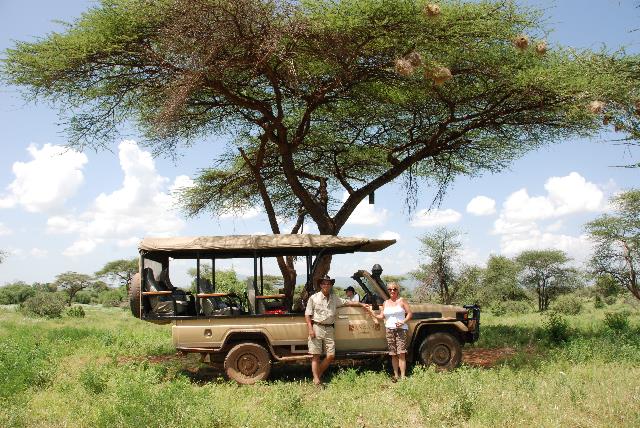 This is the open safari jeep provided by our lodge. It was comfortable and allowed us to really feel like we were out in the wild with the animals. Note the weavers nests in the acacia tree above.