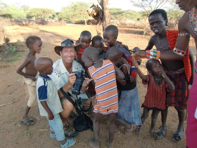 | The Samburu kids went absolutely nuts when Randy took their digital photo and then immediately showed it to them. They couldn't get enough of this, crowding around trying to get a peek. Pam had to take this photo quickly because those kids didn't exactly smell too good! |