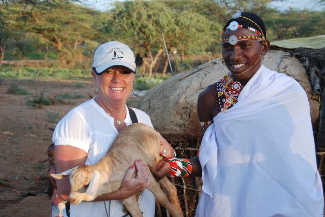 Our local Samburu guide assisted Pam to hold a baby goat. This goat then followed us all around the village and was constantly bleating.